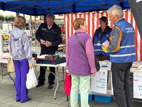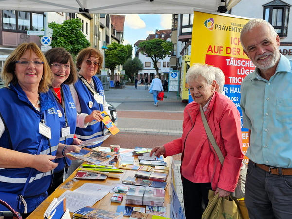 SicherheitsberatungjeweilsamerstenSamstagimMonat auf dem Kelkheimer MarktplatzAm06.09.25wurdedurchdieSicherheitsberater/-innenfür Senioren,PetraKrause,SimoneSieß,GüntherBredefeld,Dagmar Lörzer,MichaelLörzerundHelmutLoos,inderZeitvon08:15bis 13.00UhreinInfostandamMarkplatzinKelkheimeingerichtet. BeisonnigemWetterkonntenimRahmendesdortigen WochenmarktesPersonen/Marktbesucherangesprochen,in GesprächeninformiertundmitvorhandenenFlyernversorgt werden.WeitereInformationaufderInternetseitevomPräventionsratMain-Taunus-Kreis.