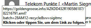 Löschen Sie derartige E-Mails und klicken Sie nichts an. Der Text in einer derartigen E-Mail besteht nicht aus Text, sondern der gesamte Inhalt der E-Mail ist ein Bild. Wenn Sie mit der Maus über das Bild fahren, wird Ihnen ein Link (siehe Bild) angezeigt der NICHT zur Telekom führt.Eine Info von der Telekom finden Sie hier.Eine aktuelle Info (21.01.2025) finden Sie hier.Informationen dazu finden Sie auch unter diesem Link.Wie eine derartige E-Mail aussehen kann, sehen Siein einer PDF-Datei, wenn Sie das Bild anklicken.